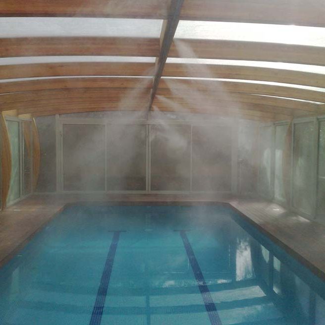 Instalación de un sistema de Nebulizadores de agua para el enfriamiento del ambiente gracias la pulverización del agua sin gastar electricidad. Estos nebulizadores serían la forma más económica para disminuir la temperatura al exterior bajando casi 11º la temperatura ambiente.